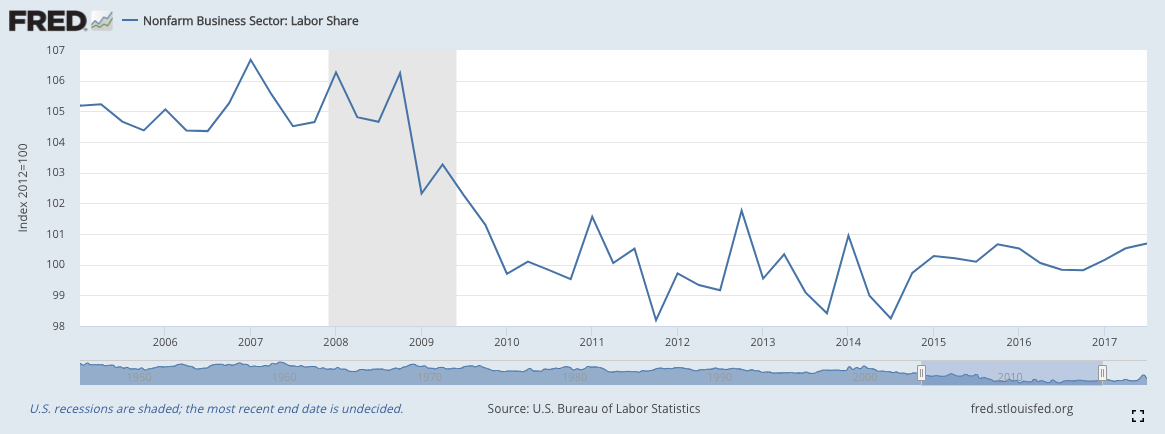 (Labor share of profits before, during, and after the Great Recession. Chart by St. Louis Fed)