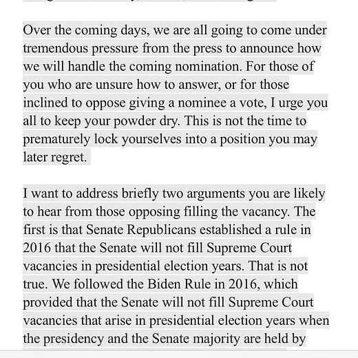 To no one’s surprise (outside of the naive beltway commentariat), while Ginsburg’s body was still warm, Mitch McConnell announced that President Trump’s soon-to-be-named Supreme Court appointee would get a floor vote in the US Senate. This means McConnell is abandoning the rule he made up in 2016 as a way of denying a confirmation hearing for President Obama’s third Supreme Court appointee following the death of Antonin Scalia (note the date on the below tweet).