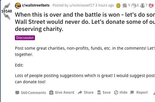 “When this is over and the battle is won - let’s do something the fat cats on Wall Street would never do. Let’s donate some of our earnings to a deserving charity,” one Redditor wrote. “Post some great charities, non-profits, funds, etc. in the comments! Let’s give to those in need together.”