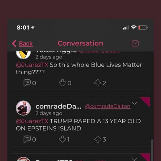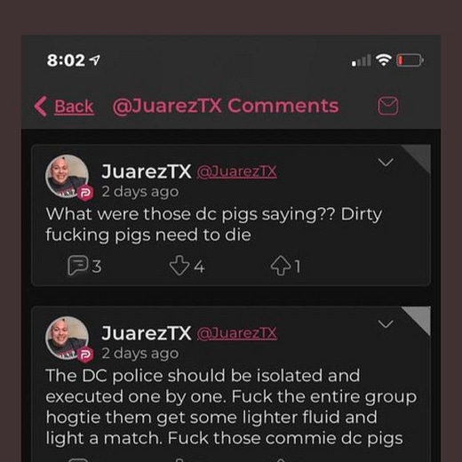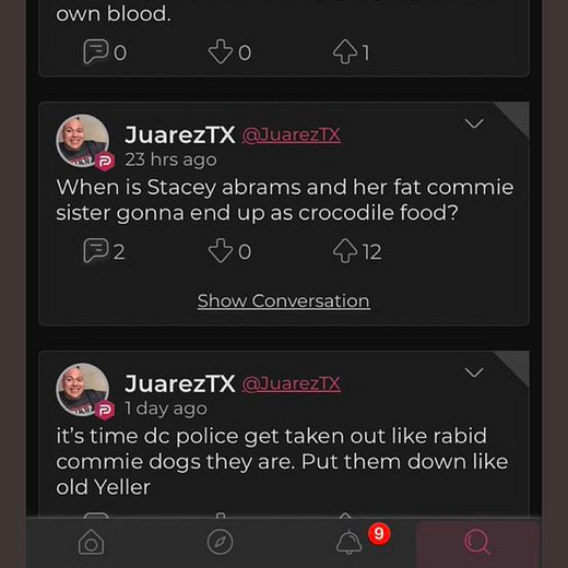To underscore Broderick’s point, Twitter user @TiffanyNeel3 took screenshots of several posts from Parler user @JuarezTX, who called for a U-Haul truck to be rigged with explosives and detonated outside of former President Barack Obama’s home. Other posts showed him wanting to “teach the commie marxist libs democrats a lesson” and fantasizing about genocide. Several of his posts got multiple upvotes from other Parler users (@JuarezTX is a verified Parler user, meaning the platform has a copy of his government identification).