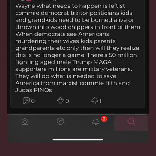 “[W]hat needs to happen is leftist commie democrat traitor politicians kids and grandkids need to be burned alive and thrown into wood chippers in front of them. When democrats see Americans murdering their wives kids parents grandparents etc only then will they realize this is no longer a game.”